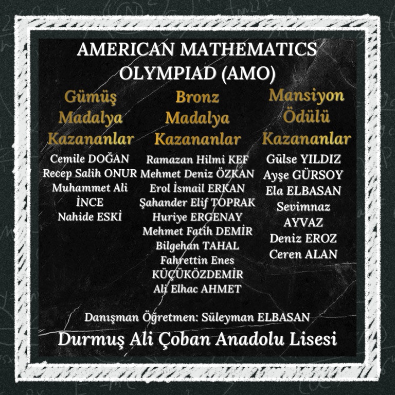 Amerikan Matematik Olimpiyatlarında öğrencilerimiz gümüş madalya, bronz madalya ve mansiyon ödülü kazanmışlardır. Okulumuzun AMO yarışmasına ev sahipliği yapmasını sağlayan ve öğrencilerimizi sınava hazırlayan Matematik Öğretmenimiz Süleyman ELBASAN'a teşekkür ederiz.